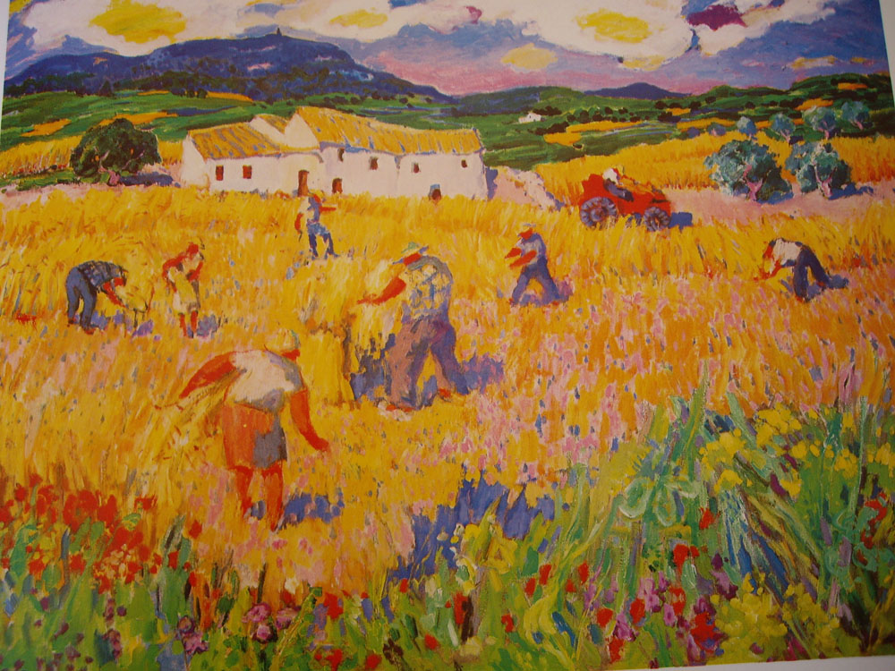 Ramon Sanvisens Marfull fa vibrar, en les seves obres, els sembrats, les oliveres, les vinyes, els ametllers, el mar, amb una explosió de colors blaus, grocs i vermells.