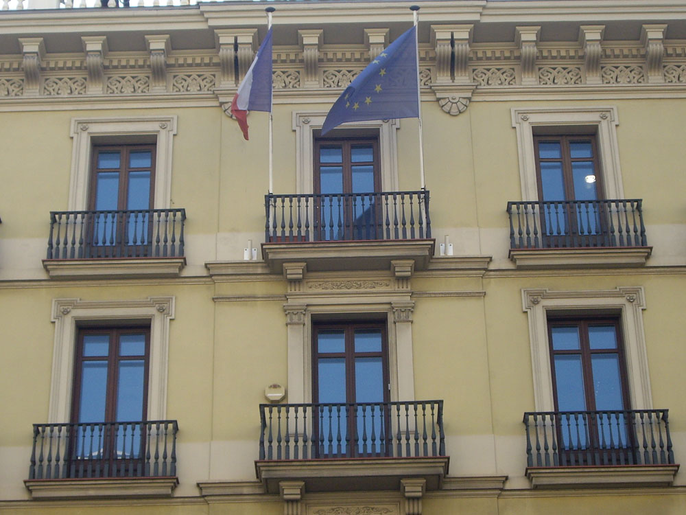 Manifestants del districte de Sant Martí de Provençals davant el Consulat de França, a la Ronda Universitat, 22, de Barcelona, mostrant la seva solidaritat amb les armilles grogues franceses, en la seves reivindicacions contra les reformes del president Macron.